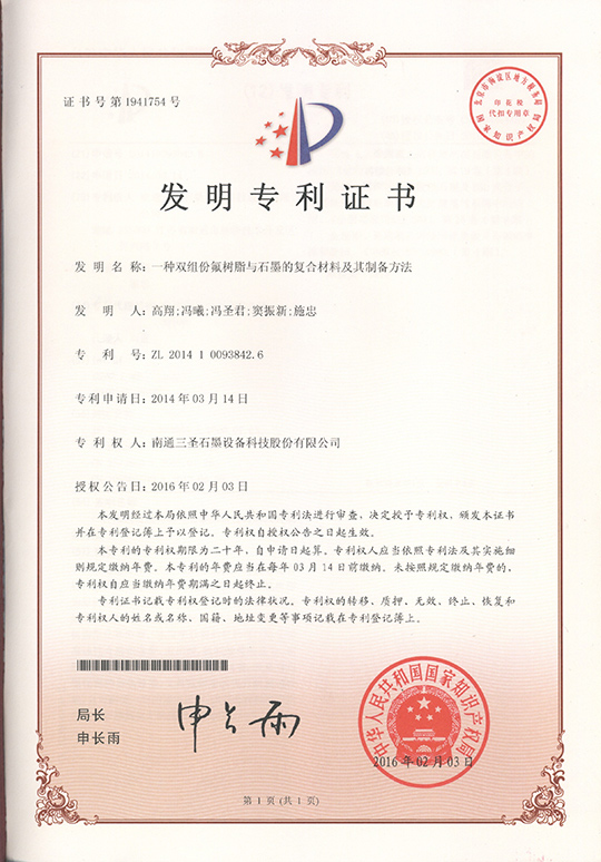 2016年2月18日,南通三圣石墨設(shè)備科技股份有限公司收到國家知識產(chǎn)權(quán)局的發(fā)明專利證書,該公司的發(fā)明專利"一種雙組份氟樹脂與石墨的復(fù)合材料及其制備方法"獲得了國家授權(quán)。該項專利涉及一種完全意義上的新型氟-石墨復(fù)合材料,該復(fù)合材料既具有石墨優(yōu)良的導(dǎo)熱性能,又具有優(yōu)異的耐腐蝕性能,由該種材料制成的換熱設(shè)備可用于強(qiáng)腐蝕工況條件下的換熱,打破了此前常規(guī)設(shè)備滲透壓力耐受瓶頸,實現(xiàn)了鋼鐵酸洗工序上酸液換熱設(shè)備的國產(chǎn)化。