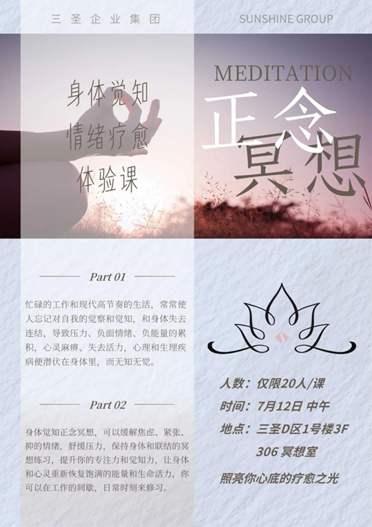 三圣集團(tuán)最新開設(shè)的冥想課程,旨在幫助職工通過冥想達(dá)到內(nèi)心的寧靜與平和,提升個人的情緒管理、專注力和生活質(zhì)量。隨著今天第一堂體驗(yàn)課的啟動,之后每周都有免費(fèi)的公益課程可報名參加。這一全新形式的開放課程,升華了三圣企業(yè)文化的精神內(nèi)涵。