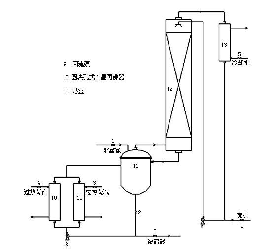 本系統(tǒng)采用先進(jìn)設(shè)計(jì)理念,將生產(chǎn)過(guò)程產(chǎn)生的15%-25%的稀醋酸濃縮到99%,在此過(guò)程中使排放的廢水達(dá)到環(huán)保標(biāo)準(zhǔn)。系統(tǒng)主體設(shè)備-石墨精餾塔,采用聚四氟乙烯浸漬石墨新型材料制造,整個(gè)系統(tǒng)具有工藝先進(jìn),操作簡(jiǎn)便,運(yùn)行費(fèi)用少,使用年限長(zhǎng)的特點(diǎn),目前,該系統(tǒng)已在浙江龍盛集團(tuán)、浙江閏土集團(tuán)成功運(yùn)行。